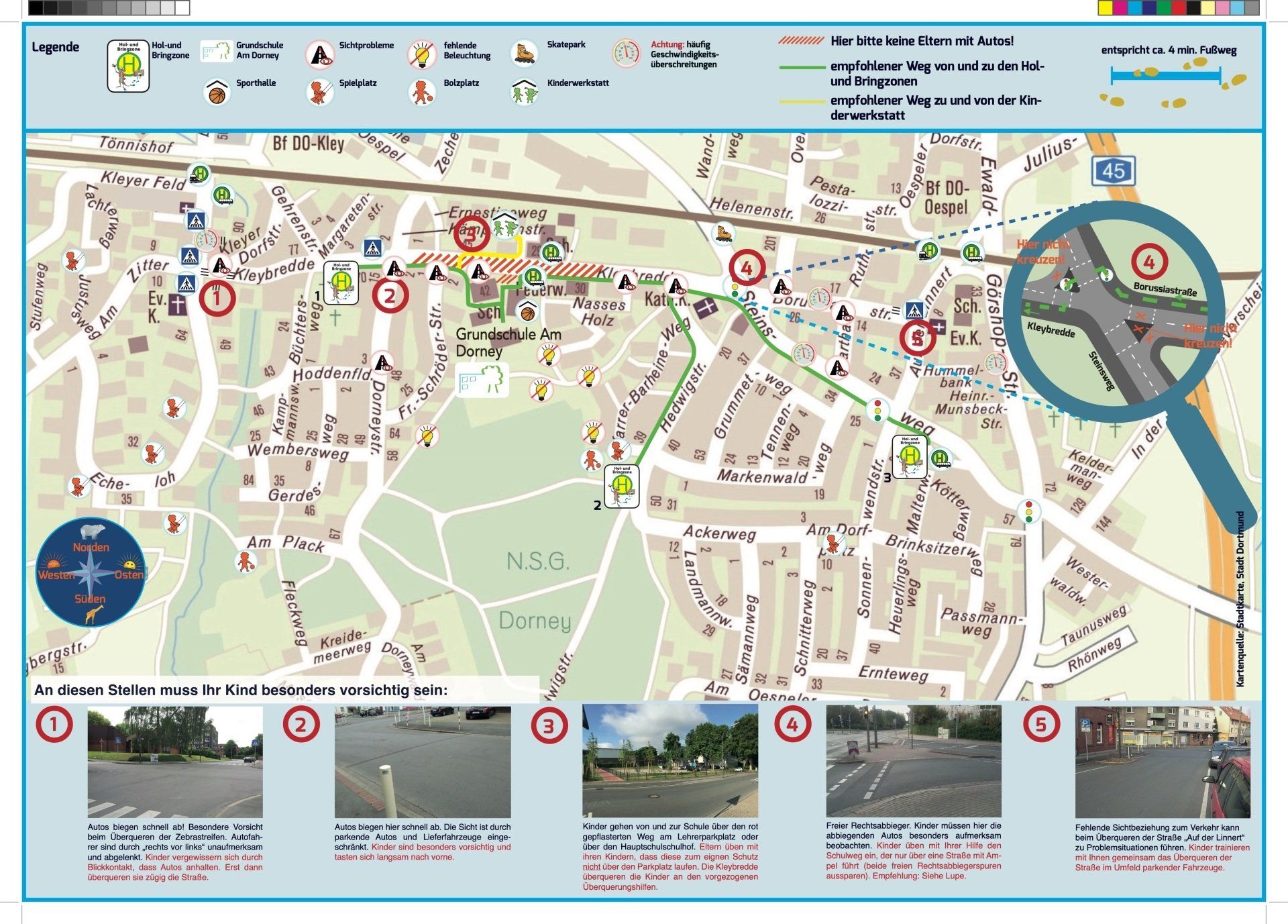 Zum Schuljahr 2016/17 wurde unser neuer Schulwegplan fertiggestellt. Dieser unterstützt insbesondere die Eltern unserer neuen Schulanfänger dabei, einen sicheren Schulweg auszuwählen, gibt Empfehlungen und weist Sie und Ihre Kinder auf konkrete Gefahrenstellen hin. Ihre Aufgabe ist es, mit Ihrem Kind den Schulweg einzuüben und immer mal wieder zu überprüfen, wie sich Ihr Kind auf dem Schulweg verhält, indem Sie es beobachten. Dadurch stärken Sie das Vertrauen Ihres Kindes in sein richtiges Fußgängerverhalten. Es lernt, sich sicher im Straßenverkehr zu bewegen, Gefahren einzuschätzen und auf sich aufzupassen. Seien Sie dabei bitte stets ein Vorbild! Damit Ihr Kind besser und schneller gesehen wird, trägt es helle Kleidung sowie eine Sicherheitsweste.